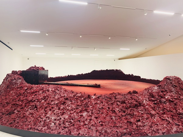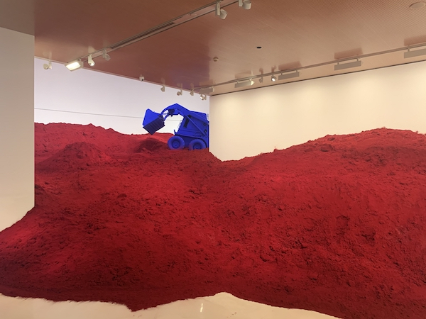在三层的几个连通的白色空间中,是卡普尔曾于2017年在阿根廷纪念公园展出的工业景观作品《远行》(2017),一辆涂满湛蓝颜色的挖掘机爬伏在几百吨红色泥土上,形成鲜明的对比。漫山遍野的红色色粉如浪涌一般,层层叠障,形成热烈的景观。