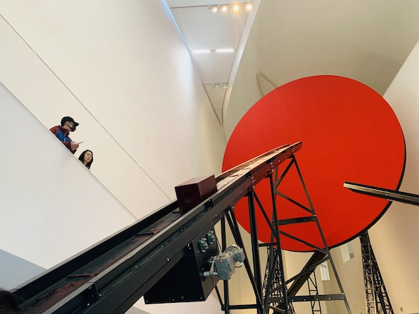 在美术馆四层,是另一件巨型自动装置作品《我的红色家乡》(2003)。机器带动一条金属臂沿着装有25吨红色软质蜡的开口容器的表面转动。金属臂在一个小时的转动中,环绕着蜡质表面缓慢运动,好像在搅拌材料,不断塑造蜡的形状,反复形成景观。