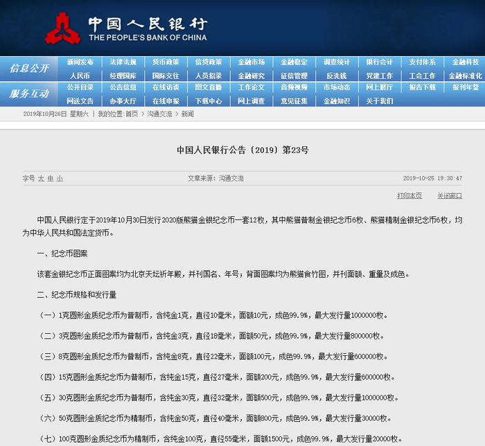 据中国人民银行官网消息,中国人民银行定于2019年10月30日发行2020版熊猫金银纪念币一套12枚,其中熊猫普制金银纪念币6枚、熊猫精制金银纪念币6枚,均为中华人民共和国法定货币。