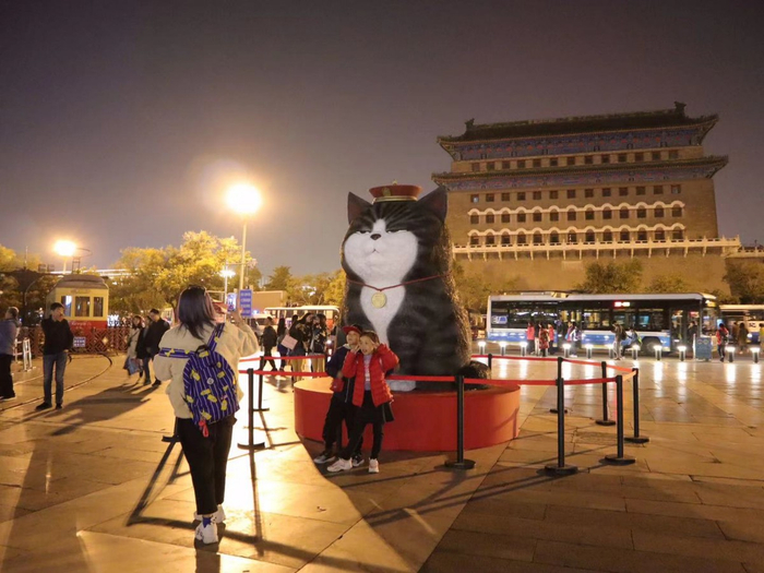 “这是吾皇,它还有一个好朋友叫巴扎黑。”雕塑前,一位10岁左右的小姑娘正向妈妈介绍说,“我在盲盒里见过它,特别可爱!”然而小姑娘的母亲却有些不理解,“前门是历史古迹,放这种卡通玩偶是不是不太合适啊?”然而,这种疑问显然挡不住游客和萌猫合影的热情。