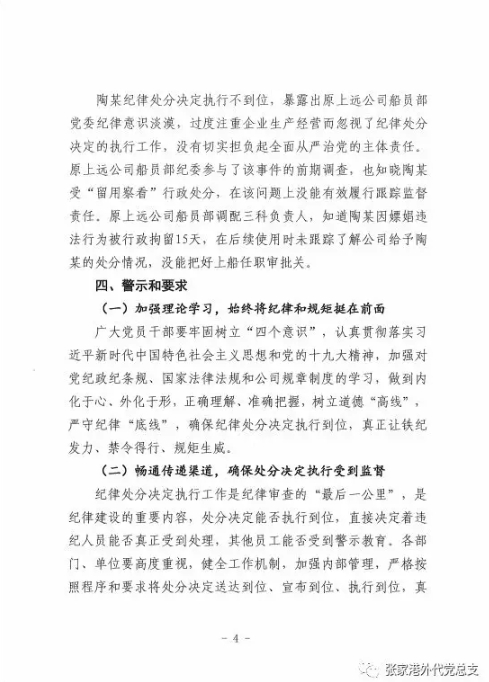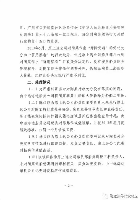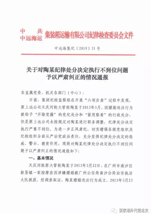 近期,一份由中远海运集装箱运输有限公司纪委9月19日印发、关于“纠正纪律处分决定执行不到位问题”的文件在多个部门传达,10月26日,中国张家港外轮代理有限公司微信公号“张家港外代党总支”刊发了全文。文件透露,日前,集团纪检监察组在开展“六项自查”中发现,原上远公司天庆河轮大管轮陶某于2013年5月因嫖娼违法行为被给予开除党籍的党纪处分和留用察看的行政处分,但是原上远公司未按规定对陶某进行职务调整,纪律处分决定执行严重不到位,现予以严肃纠正。