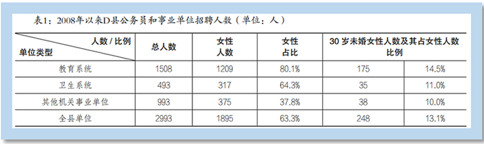 笔者在从事县域治理研究时,意外发现中西部等偏远地区的县域体制内有大量的大龄未婚女性。以我们调研的D县为例,该县自2008年以来新招聘总人数为2993人,其中女性1895人,在这些女性中,目前30岁以上未婚女性约有248人(这一数据没有包括2008年之前招聘的女性中目前仍单身者)。我们发现,D县域政府的不少部门机关都存在未婚大龄女性,而在教育系统中,几乎每个学校都有大龄未婚女老师,其中又以乡村女教师居多。