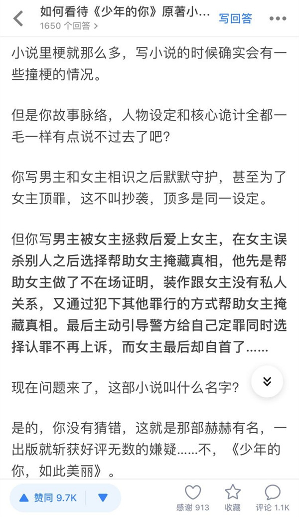 而这样的争议自原著小说《少年的你,如此美丽》发表时起就一直伴随。从小说改编成电影的消息传出的近两年来,东野圭吾的书迷以及一些反感抄袭的网友也一直持续在互联网上对原作者玖月晞发起声讨。甚至有网友直接将东野圭吾的作品与玖月晞的作品,情节做成了表格进行对比。