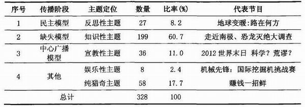 实际上,科普经历了好几个阶段,一是以科学共同体为中心的科普,可以理解为传统科普,一是以媒体为中心的科普,主要目的是希望公众理解科学,可以称之为科学传播,第三阶段则是希望公众不仅理解科学还参与科学,称之为公民科学或者公众参与科学。《走近科学》比较热门的时代正好是科普从第一阶段到第二阶段过渡的时期,仍以2012年节目为例,分析节目的主题内容(见下表),会发现单纯的知识性普及至少占据了三分之二以上,而同时期的美国科普节目则以反思性内容和知识性内容比例大体相当。同时《走近科学》纯猎奇的内容也占据了不小比例,加上探秘类的内容往往流于形式,无法给出科学的解释,归诸简单的民俗或者显而易见的事实,虽然对于农民等群体能达到很好的去魅作用,但显然无法满足高级知识分子的取向,这也导致了在掌握了公共话语权的知识分子眼中,这档节目以博眼球取胜。
