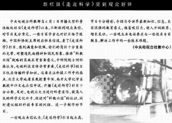 2002年6月《中华人民共和国科学技术普及法》正式颁布,第一条就开宗明义指出为了科教兴国战略和可持续发展战略,加强科学普及。几乎与此同时,中央电视台科学·教育频道(CCTV10)在2001年7月9日正式推出,中国电视史上专门有了一块科学传播的阵地,《走近科学》同步在黄金时间播出,其宗旨是“发扬科学精神;宣扬科学思想;提倡科学方法;传播科学知识”。