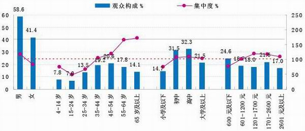 今天还在收看《走近科学》年轻观众已然不多,实际上自媒体前夕,这一趋势已经明显,根据调查,2011年科教频道在71大中城市观众中,男性、35-54岁、初高中学历、600元以下及1701-2600元个人月收入水平的观众构成比例相对较高;从集中度上看,男性、45岁及以上、初高中学历、个人月收入在1201-2600元水平的观众集中度相对较高(见图)。