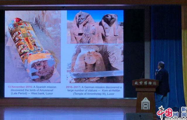 图为埃及古物部科学办公室主管哈尼•艾尔塔耶普演讲 中国网记者 苏向东/摄