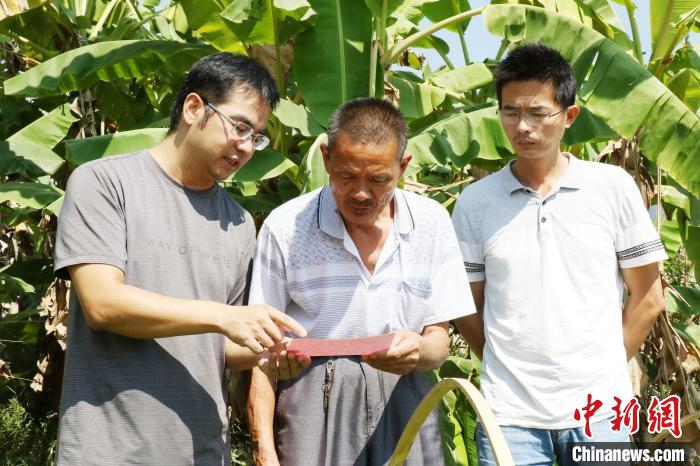 梅林镇征迁干部黄永彬(左一)为官洋溪西岸村民简梦龙送上选房单。供图
