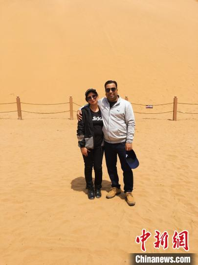 Nitesh(右)和Rakhi(左)在宁夏中卫沙坡头景点游玩留影。 受访者供图 摄