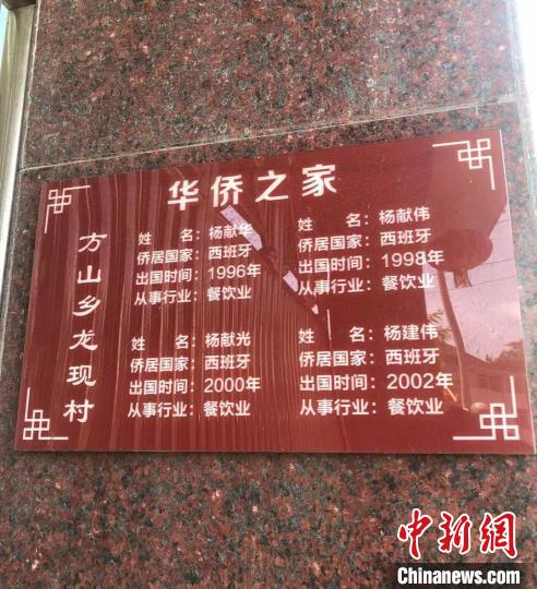 龙现村几乎每户人家墙上都会贴有一块“华侨之家”的牌子,上面写有该户人家出国人员的姓名、侨居国家、出国时间、从事行业的信息 周悦磊 摄