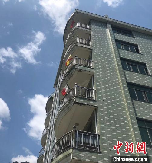 龙现村内一户住宅外,飘扬着四面不同的国旗,这意味着一家有四人侨居在四个不同的国家 周悦磊 摄