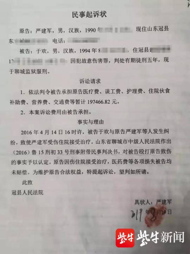 同时,严建军的这次起诉属于重复起诉,在2016年11月他曾在刑事附带民事诉讼中,提出“依法判令被告支付原告医疗费、误工费、护理费、住院伙食补助费、交通费等暂计50万元”,此次的民事起诉状又载明“依法判令被告承担原告医疗费、误工费、护理费、住院伙食补助费、营养费、交通费等暂计197466.82元”。