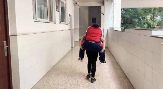 豆豆家距离学校约两公里,豆妈每天至少来回4趟。如今豆豆已经是文津中学一名初二学生,这一背就是8年,妈妈的背是豆豆的坚实“港湾”,每天上下楼,妈妈背着她;去洗手间,妈妈背着她……