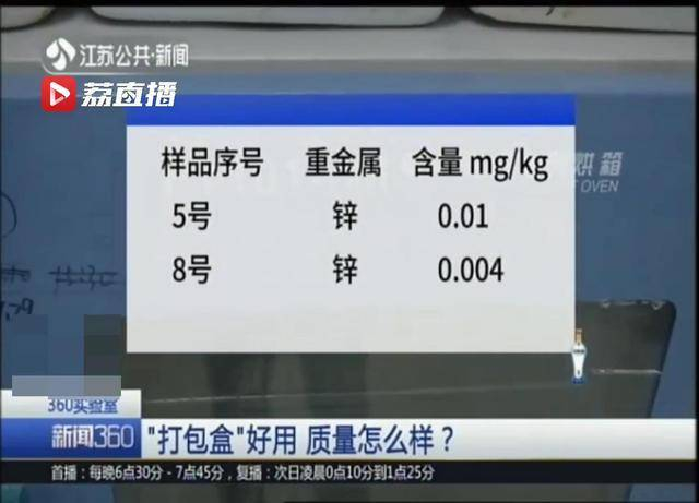 在100摄氏度,1小时条件下,10%乙醇的总迁移量指标没有超标;在60摄氏度,1小时条件下,异辛烷的总迁移量指标也没有超标,说明高温下,餐盒中有害有毒的物质不会过多地析出迁移到食品中。8个餐盒均没有检测出塑化剂,有5个餐盒测出微量重金属,但含量均符合国家标准。(字幕标注5个餐盒重金属含量)质检人员表示,目前市场上使用的一次性打包盒质量基本没有问题,不排除少部分可能会存在重金属超标和违规使用塑化剂的现象。