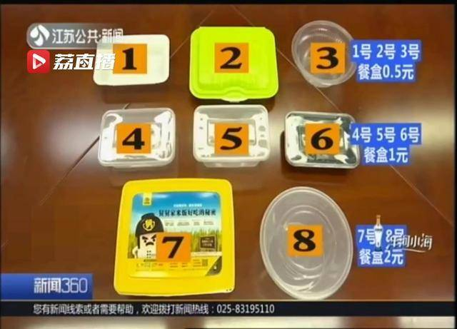 目前,市场上的一次性餐盒大多是由聚丙烯制成,这种材料熔点高。在餐盒上,有一个循环的三角型,标注数字"5",表示聚丙烯。记者随机在不同的餐厅里,选购了8款聚丙烯制成的一次性餐盒。
