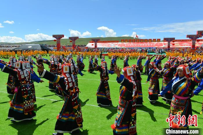 图为2019年8月10日,西藏那曲牧民载歌载舞迎接一年一度的赛马节。(资料图) 江飞波 摄