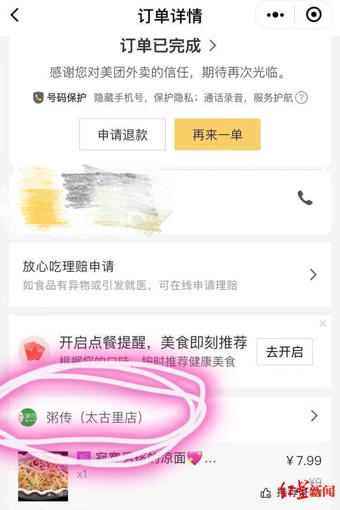 网友称外卖吃到蟑螂