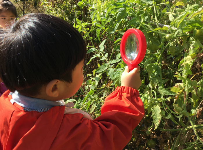 田垄上,孩子们走得轻车熟路,每个人都要求和绿油油的蔬菜拍照留念。老师一声令下,孩子们有的摘、有的收,各司其职。摘下来的西红柿大小不一,老师引导孩子们比大小,观察不同形状。辣椒藏在绿油油的叶子下面,孩子们耐心地寻找着。葫芦爬得太高了,老师搬来了梯子,孩子们勇敢地爬上去摘。