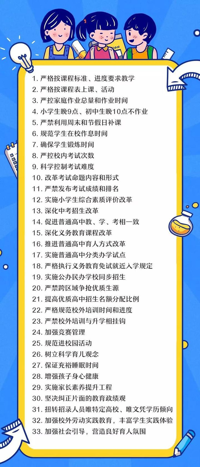 33。加强社会引导,营造良好育人氛围。严禁各类新闻媒体炒作考试成绩排名和升学率,不得以任何形式宣传所谓的中考、高考“状元”。加强对网站、自媒体平台等的监管和引导,防止对减负工作的误导。推出中小学生减负公益广告,健全完善社会心理疏导机制,共同关心孩子成长。