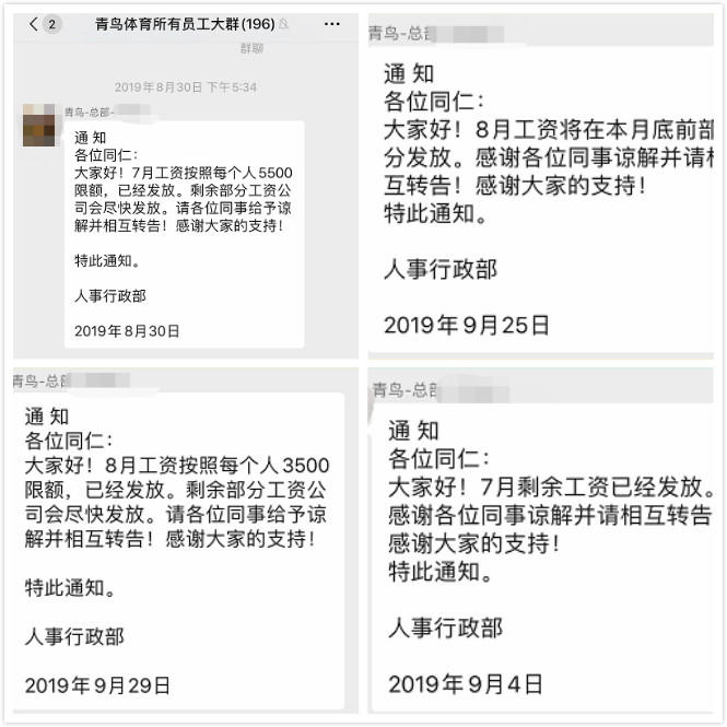 更明显的变化发生在8月份,工资开始不再完整进入每个员工的账户。据刘某某提供的相关图片材料,8月30日,青鸟体育总部一名员工以人事行政部名义发布通知称:“7月工资按照每个人5500(元)限额发放。”9月29日,上述总部员工再次在群里发布通知,称“8月工资按照每个人3500(元)限额发放。”10月8日,该名员工又发布通知,称“8月工资按照每个人剩余部分补充发放3000元。”