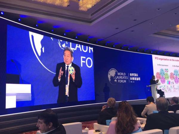 10月29日,清华大学教授、上海科技大学特聘教授、中国科学院院士、结构生物学家饶子和手持一类似俄罗斯套娃结构的3D模型,在第二届世界顶尖科学家论坛主旨演讲环节再次介绍其团队最新的研究重点。 澎湃新闻记者 张若婷 图。