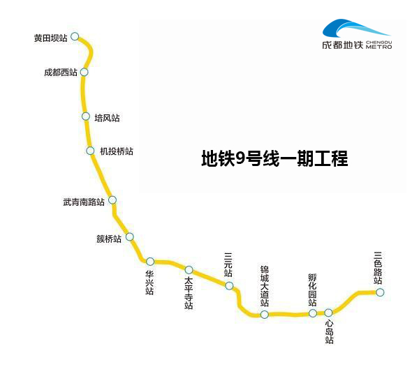 9号线一期工程从三色站至黄田坝站由南至西沿顺时针方向敷设,线路全长22.18km,共设13座车站,11座换乘站,均为地下站,设元华停车场、武青车辆段两座站场。
