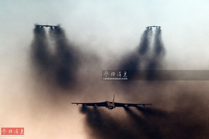 这张著名的B-52G机群MITO起飞资料图摄于1986年,同样是在巴克斯代尔基地,由于喷水加力致使航空燃油燃烧不充分,机群拖出的黑色航迹很有“黑云遮日”效果。