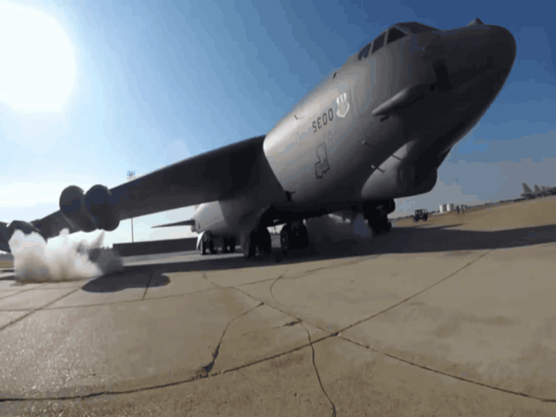 为完成MITO,B-52H的8台普惠TF33-P-3/103涡扇发动机都配有“紧急启动装置”(据称使用可控火药点燃)和喷水加力系统(可瞬时增加发动机推力,但代价是会导致燃油燃烧不完全而喷出黑烟),可大幅缩短起飞准备时间,防止被苏军核导弹“一锅端”。图为B-52H使用“紧急启动装置”发动瞬间,可见发动机喷出的白烟。