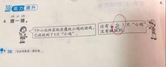 这是一道小学一年级的数学题:7个小朋友玩“老鹰捉小鸡”游戏,已经捉到了3只小鸡,问还有多少只小鸡?贵阳一小学生的答案是“2”,但老师认为是错的。家长很不解,带着疑问发到朋友圈,引起不少争议。