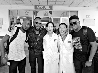 就在和杨玉云微信语音连线时,雅温得妇儿分队分队长王峰也给山西晚报记者发来了一张照片和一首曲子。照片是王峰和几个非洲患者的合影,其中一名男性也是当地有名的歌星,是王峰的老患者了。得知王峰就要结束援助,专程过来看望他并合影留念,还送上了特别为王峰创作的《中喀一家人》的音频。