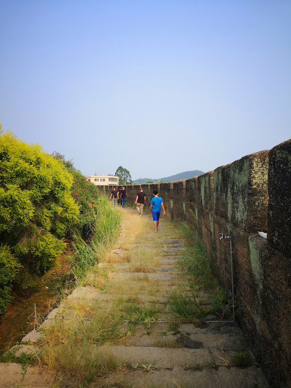 走在城墙的马道上,茂密的野草与石板路、城垛一道营造出悠远古朴的意味。这里其实已是古城的制高点,望向老城,一排排闽南民宅整齐划一。当年黄性震建堡之时,理念已极超前,每排民房间有八米宽的石砌街道可供通行,俨然现代城市格局。