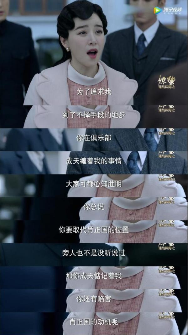 尤其是周海潮。他一直觊觎肖正国的科长之位,也喜欢肖正国的妻子余小晚(阙清子 饰)。在肖正国消失的那段时间,他疯狂追求余小晚。在周海潮杀害李伯钧栽赃“肖正国”后,余小晚到军统总部大闹,当着所有人的面对周海潮各种冷嘲热讽,将周海潮对她的爱,以及周海潮的自尊扔在地上踩。但周海潮只是常态性的反应,让余小晚别胡说。心狠手辣的周海潮被死对头“抢走”了职位和女人,现在心爱的女人为了死对头大庭广众下羞辱自己,他还如此平静?一点自尊都没有?