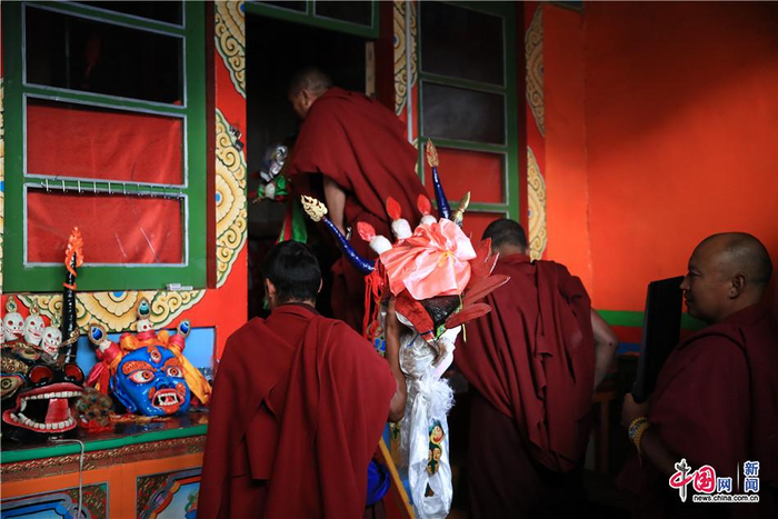 藏戏被称为藏文化活化石,面具的不同颜色对应着所代表人物的不同性格。图为边坝寺内,藏戏面具展示。中国网记者 栗卫斌 摄