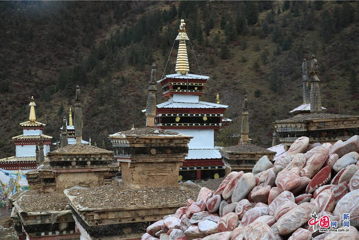 位于川藏北线317国道上的卡玛多塔林,曾有108座佛塔,后由于各种原因出现损坏,现如今部分佛塔已恢复修建。佛塔旁堆积着玛尼石。中国网记者 栗卫斌 摄