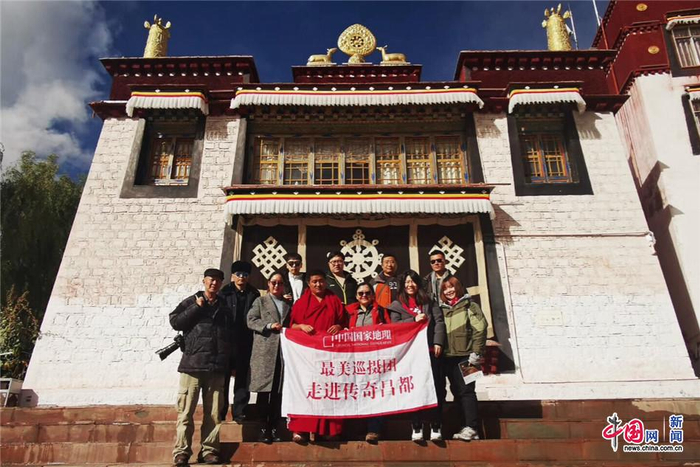 巡摄团与驻寺僧人在昌都市卡若区强巴林寺前合影。