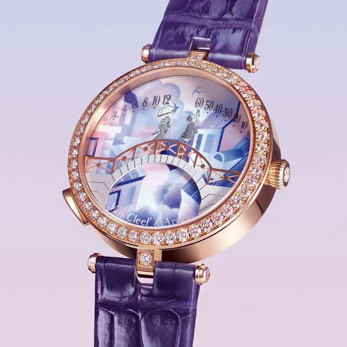 Lady Arpels Pont des Amoureux腕表自问世以来已有九年,成为Van Cleef & Arpels梵克雅宝的诗意时间中夺目的诗篇。今年,世家为Lady Arpels Pont des Amoureux腕表系列呈献全新的“日间”版本,让这对恋人,于良辰之中相逢。每枚腕表均搭载自动上链机械机芯,内置专为世家独家研发的逆跳模块。年轻貌美的淑女每小时亦步向前,而伫立对岸的爱人则每分钟前行一步往返拱桥,翘首以盼。二人最终于正午和午夜相拥。