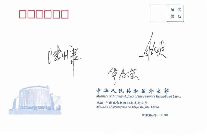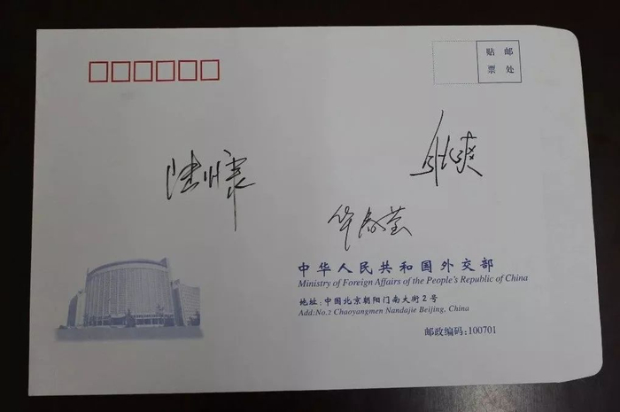 信末,外交部发言人办公室鼓励刘佳奇和同学们:“期待有一天,你们中的一些人也能与我们并肩作战,为构建新时代中国特色大国外交贡献智慧和力量。”与信函一同附上的,还有外交部发言人陆慷、华春莹、耿爽的签名信封。