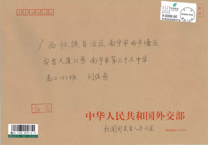 广西南宁的这位同学收到了外交部的回信