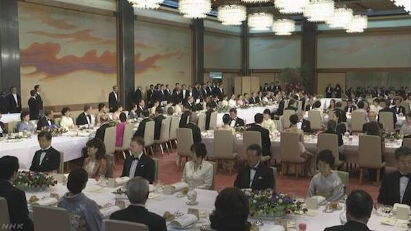 今年五月份,招待访日的美国总统特朗普的宫中晚餐会,地点位于皇居丰明殿。宫中晚餐会的座席大多采用这样的横E字型排列。