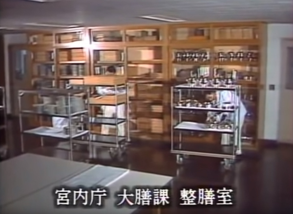 宫中晚餐会前,在大膳课整膳室准备餐具的主膳。图像来源于找昭和时期宫内厅的宣传片,因为时代久远,清晰度实在欠佳。