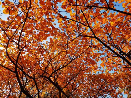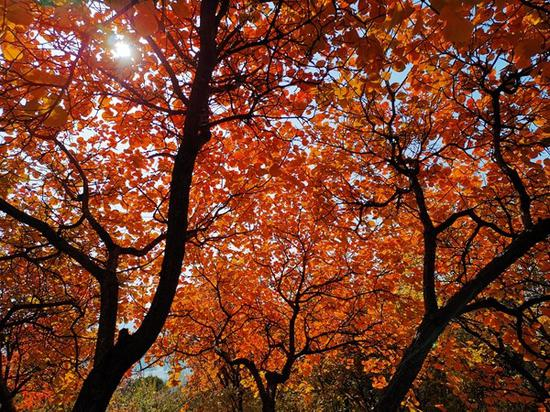 小西山的彩叶树多种植于50年代末期,此时正值壮年。多年来,公园加强森林抚育及病虫害防治力度,经过精心管护,小西山的红叶十分绮丽。今年气温下降迅速,昼夜温差大,对红叶的形成非常有利。