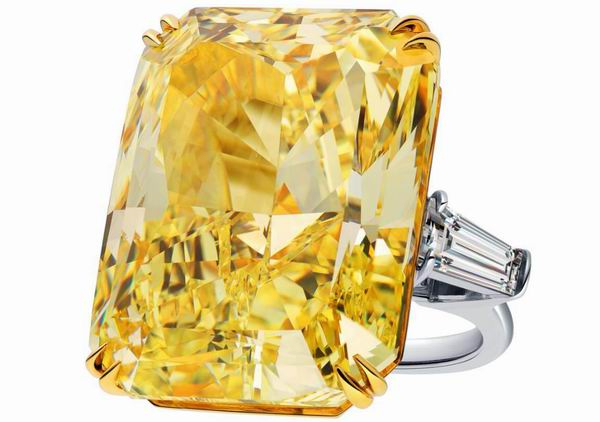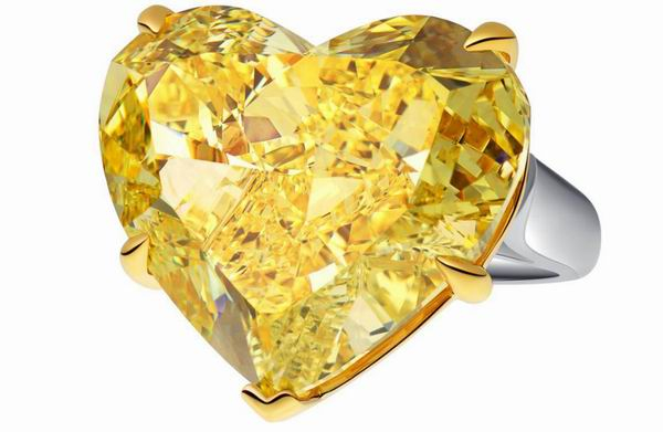 海瑞温斯顿心型切工单颗黄钻戒指总重约45.22克拉,无边钻,悉心镶嵌于黄18K金和铂金底座。