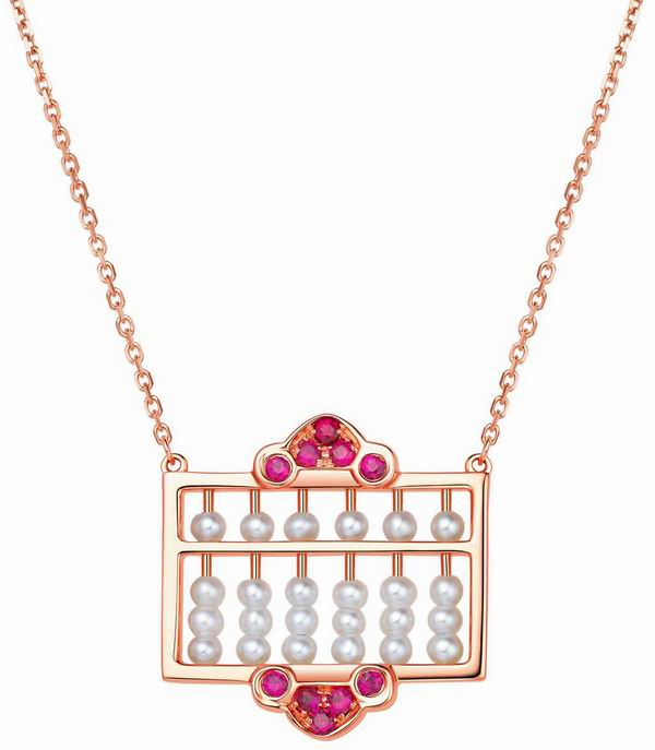 如意珍珠算盘项链18K金、珍珠红宝石镶嵌