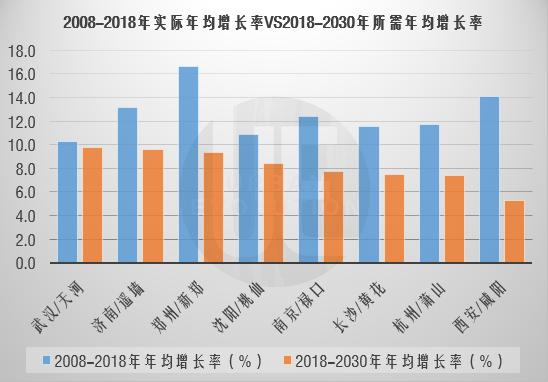 从年均增长率看,过去10年,8座城市机场都保持10%以上增长,其中郑州(16.6%)、西安(14.1%)尤为出彩。而根据2030年目标计算未来年均增长率,8座城市都低于10%,增速明显放缓。
