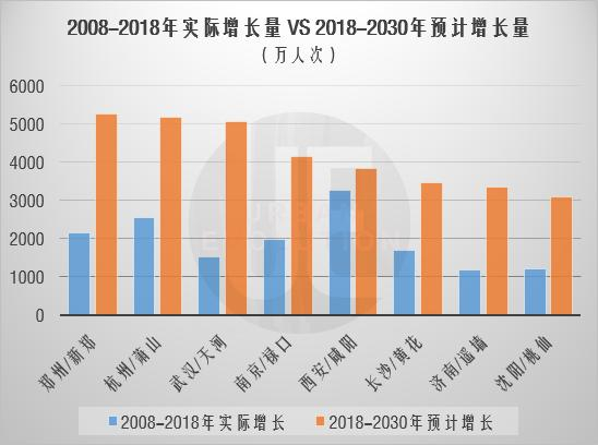从旅客吞吐量增长绝对值看,除西安外,其余7座城市机场规划的2018-2030年增长人次,远高于其过去10年增长人次,已达到约2倍差距,武汉和济南甚至达到3倍左右。