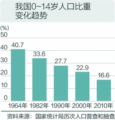根据统计数据,中国0-14岁人口比重从上世纪六七十年代到现在一路下滑:1964年为40.7%,1982年为33.6%,1990年为27.7%,2000年为22.9%,到2010年已经降为16.6%。