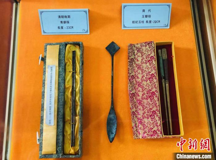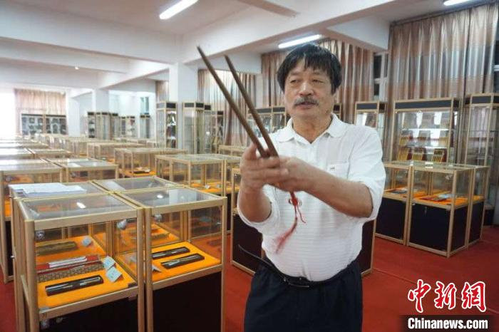 谈起陈列柜内的筷子,张国天如数家珍。 郑江洛 摄