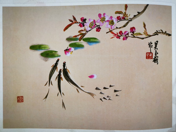 一针一线皆春意,轻挑慢捻绣丹青。作为松江顾绣传人中的代表性人物,钱月芳拥有中国刺绣艺术大师、上海工艺美术师、工艺美术大师等头衔,其作品风格多样,有苍劲嶙峋的树木、山峦叠嶂的风景,也有活灵活现的人物,但是这次为进博会展出,她特别选了一幅花鸟春色图。微风轻拂,枝丫萌绿,淡粉色的桃花绽放枝头。突然一片花瓣飘落水中,引得鱼儿竞相追逐。整幅作品看上去春意盎然,灵趣生动。