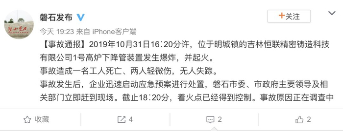 惨剧!据@磐石发布称,10月31日,吉林省吉林磐石市一钢厂高炉发生爆炸,导致1死2伤!