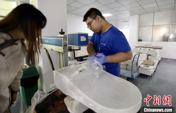 梦佳工厂的马桶正在激光刻印品牌标识。 钟欣 摄